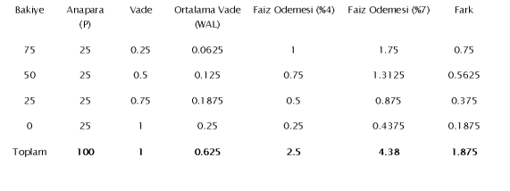 Örneğin faiz oranları %4 seviyesinden %7 seviyesine çıkar ise şirket A, tablodan da görüleceği gibi toplamda 4.38 ABD doları ödemek zorunda kalacaktır. Bu durumda fark 1.875 ABD dolarıdır. Yani faizler %4’den %7’ye çıkar ise şirketin maruz kaldığı risk 1.875 ABD dolarıdır. Yukarıdaki formülü kullanır isek;
