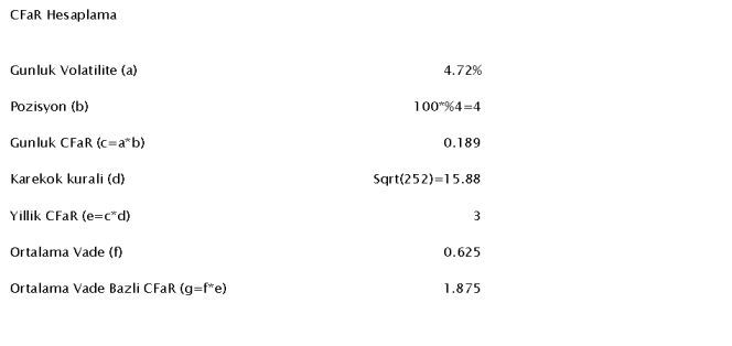 Örneğin, tarihsel libor hareketlerinden liborun günlük ortalama standart sapmasını %4.72 olarak hesaplamış olalım. Günlük standart sapma değeri olan 4.72% , faizlerin %4’den %7’ye yükselmesi sırasında hesaplanan yıllık standart sapmanın günlük hesaplanmış halini ifade etmektedir. Burada amaç, rakamsal sağlamanın yapılabilmesidir. Ayrıca gene rakamsal sağlama yapılabilmesi için 2.33 standart sapma kavramı yani %99 güven aralığı bu hesaplamada dikkate alınmamıştır. Güven aralığını dikkate alarak hesaplama yapılmak istenirse, tek yapılması gereken günlük CFaR hesabının 2.33 ile çarpılmasıdır. Bu durumda aşağıdaki tablodan da görüleceği üzere risk bir önceki hesaplama modelindeki gibi 1.875 ABD doları olacaktır.