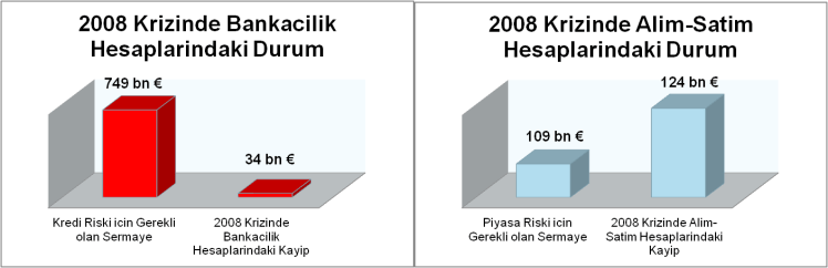 Aşağıdaki tablodan da görüleceği üzere, 150 EU ve US bankası için yapılan çalışmaya göre 2008 yılında bankacılık hesapları için ayrılan sermaye 749 milyar EUR iken kayıp sonucu eriyen sermaye sadece 34 milyar EUR olmuştur. Buna karşılık 2008 yılında alım-satım hesapları için ayrılan sermaye 109 milyar EUR iken kayıp sonucu eriyen sermaye 124 milyar EUR olarak gerçekleşmiştir. Bunun başlıca sebebi, bankaların “regulatory arbitrage” kavramından dolayı bankacılık hesaplarındaki aktifleri alım-satım hesaplarına taşıması ve ekonomik olarak maruz kalınan risk değişmese bile olması gerekenden çok daha az sermaye tutması olmuştur.