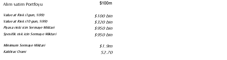 Basel II’ye göre alım-satım portföyündeki piyasa riski için bankalar 10 günlük %99 güven aralığında hesaplanan VaR değerinde sermaye ve beklenen kayıplar için de aynı koşullarda (10 gun, %99 VaR) spesifik risk sermayesi ayırmak zorundadır. Söz konusu spesifik risk, ilave temerrüt riski anlamına gelmektedir. Ayrılan spesifik risk için sermayenin de VaR değerine eşit olduğu varsayamı altında, yukarıdaki örneğe göre toplamda $100 milyonluk portföy için ayrılması gereken sermaye sadece $2 milyon civarındadır. Toplam kaldıraç oranı da yaklaşık 1’e 53’dür.