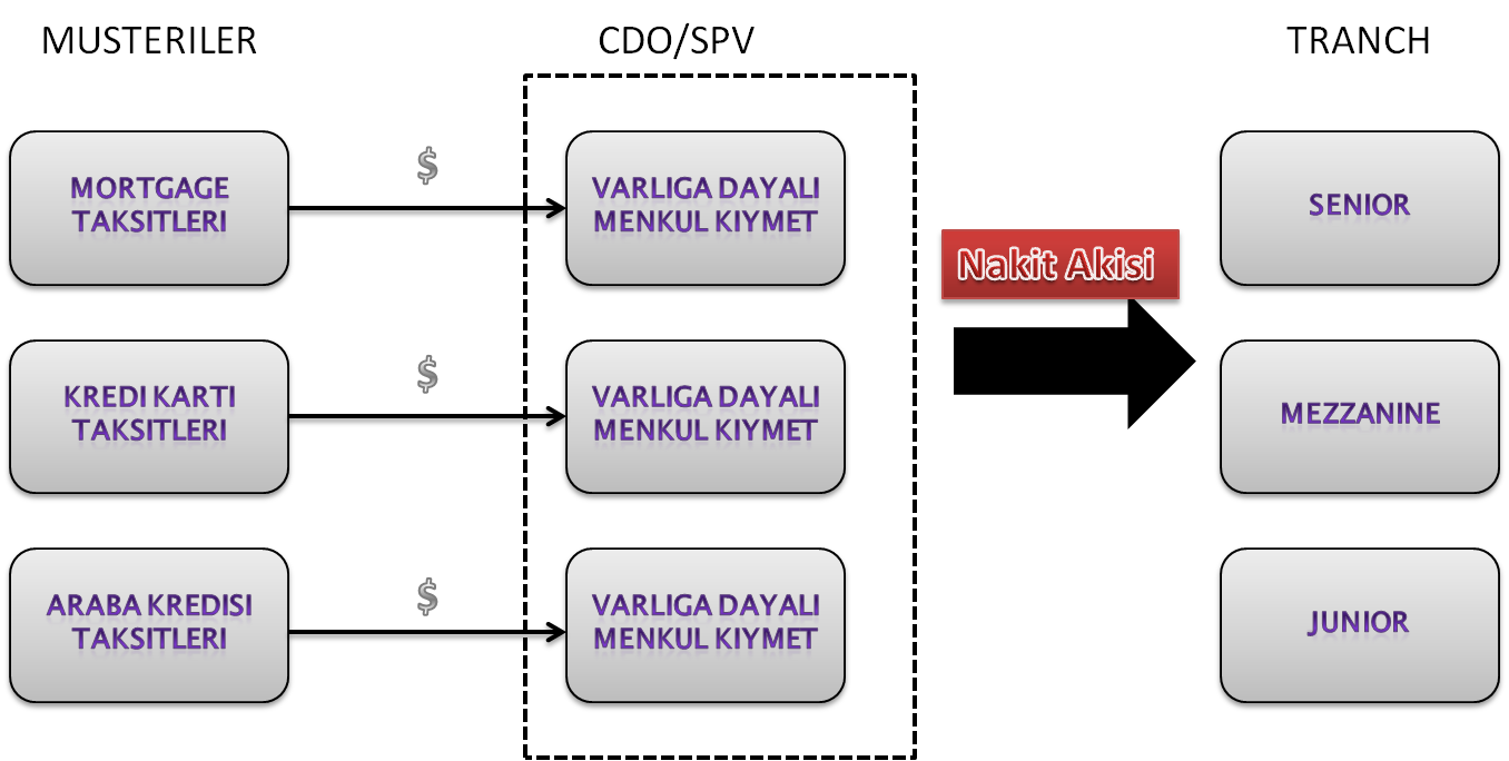 Bankalar ipoteğe dayalı ev kredisi vermektedir. Krediye konu olan ev, banka tarafından ipotek edilmektedir. Bankalar finansal matematik yardımıyla söz konusu kredinin faiz ve anapara ödemelerini dayanak göstererek ilgili krediyi veya kredi portföyünü menkulleştirip piyasada satarak daha sonraki vereceği kredi için finansman sağlamaktadırlar. Bu uygulama ile ortaya çıkan ürünün adı varlığa dayalı menkul kıymettir. Bu ürünler aynı zamanda belirli bir havuzda toplanarak yeniden ürünleştirilir ve CDO (colateralized debt obligation) olarak herhangi bir menkul kıymet gibi piyasalarda alınıp satılmaktadır. Mortgage dışında araba kredileri, bireysel krediler, kredi kartları gibi birçok kredi ürünü menkul kıymetleştirilerek (Asset backed securities-ABS, mortgage backed securities-MBS) bir havuzda toplanıp menkulleştirip CDO ürünleri oluşturulmuştur.