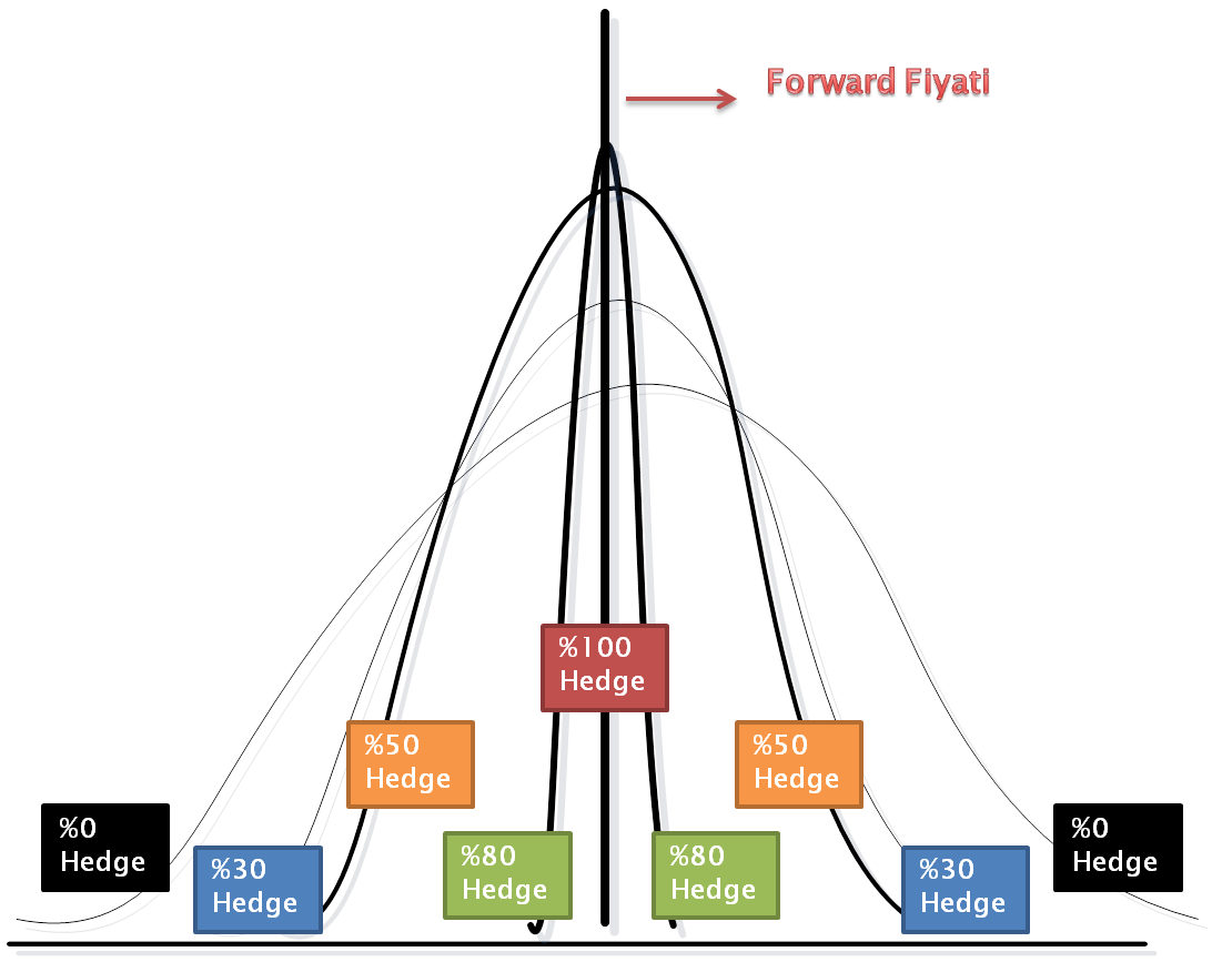 Yukarıdaki şekilde farklı hedge oranlarında şirketin maruz kaldığı fiyat ve dolayısıyla maruz kaldığı risk (varyans) görülebilmektedir. Risk hesaplaması %0 hedge durumunu ifade etmektedir. Normal dağılım varsayımı altında, risk ortalama değerin sağına ve soluna eşit şekilde dağılmaktadır. %99 güven aralığında en iyi ve en kötü piyasa fiyatı spot fiyatın iki standart sapma sağına ve soluna denk gelen fiyata eşit olacaktır.