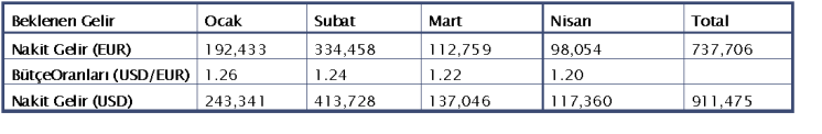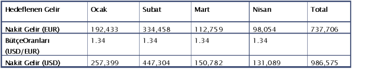 Bütçe oranlarına göre şirket 4 aylık süre içerisinde USD 986,575 değerinde nakit gelir bütçelemiştir. Şirket yukarıda belirtilen yöntemlerle monte carlo simülasyonu kullanarak oluşturduğu senaryolara göre USD/EUR kurların söz konusu vadelerde %95 güven aralığında alabilecekleri minimum değerleri belirleyerek beklenen en kötü nakit geliri hesaplamıştır.
