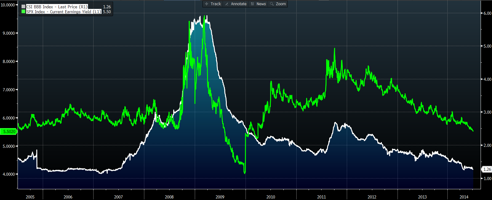 Kaynak: BloombergYukarıdaki grafikte, gerçekten de aradaki ilişki net bir şekilde belirlenmiş durumda olduğunu görebilirsin. Şuanda S&P 500 getirisi %5.5 seviyesinde ve 10 yıllık tahvil getirisi ise %2,6 seviyesinde. Hisse getirisinin tahvil getirisinden yüksek olması, FED modeline göre “hisse senedi piyasasında balon yoktur” yorumunu yapmama neden oluyor. Ama aşağıdaki grafiğe baktığımda ise zaten hiçbir zaman (en azından 2002’den beri) hisse getirisinin tahvil getirisinden yüksek olduğunu görüyorum. Yani bu modele göre hiçbir zaman balon oluşmamış dememiz gerekiyor.
