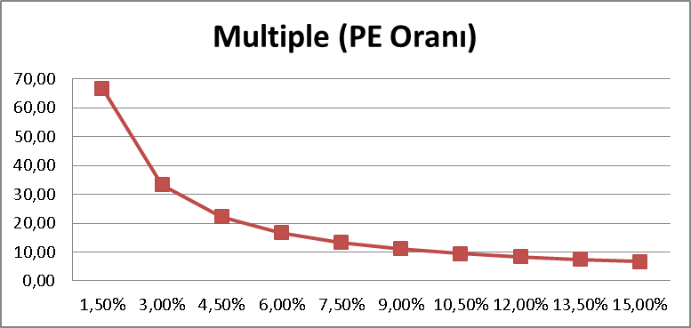 Göreceğin gibi faiz oranları yükseldikçe firmanın değeri azalıyor. Tabloda son satırdaki çarpan (“multiple”) yani PE Oranı (Price to Earning Ratio) önemli bir parametre ve bu oran, mevcut faiz seviyesinde yatırımcının, 1 dolarlık gelir için ne kadar fiyat biçtiğinin göstergesi. Örneğin 1 dolar gelir için eğer firma değeri 66,7 dolar ise P/E oranı 66,7/1=66,7 olacaktır.
